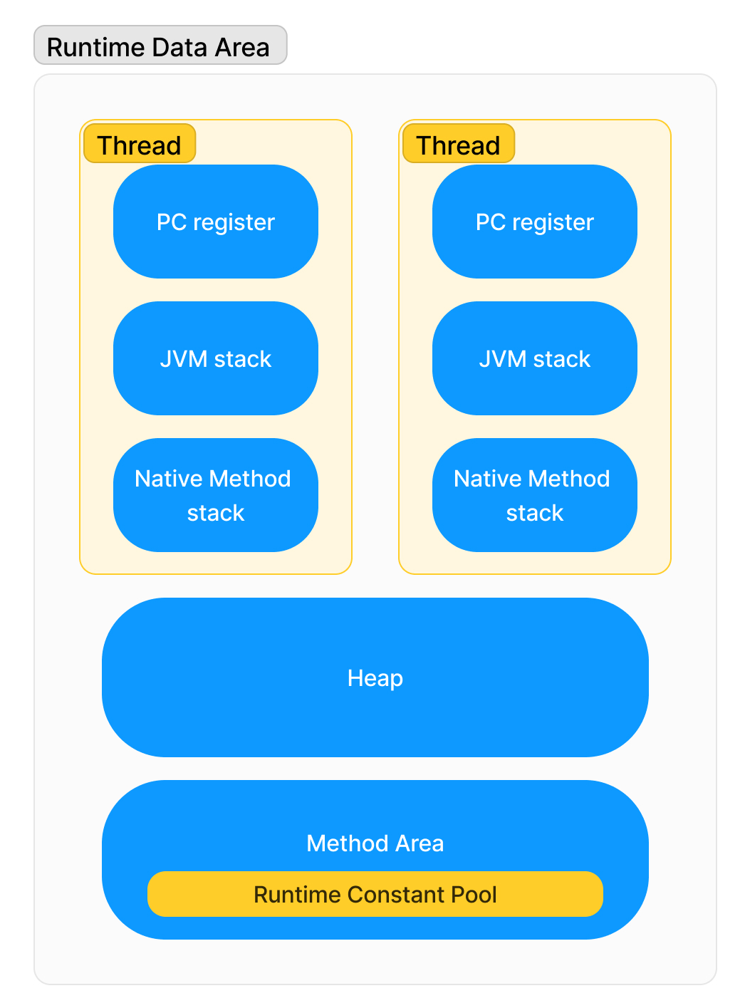 JVM의 메모리 영역은 런타임데이터 영역이다. 프로그램을 수행하기 위해 OS에서 할당받은 메모리 공간이다.