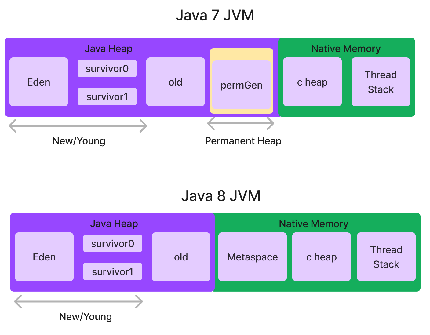그림에서 보면 힙영역에 있지만 별도의 힙 영역을 설정해 주어서 관리해야 했다. 이 때문에 java.lang.OutOfMemoryError : PermGen space이라는 오류를 발생시켰다.