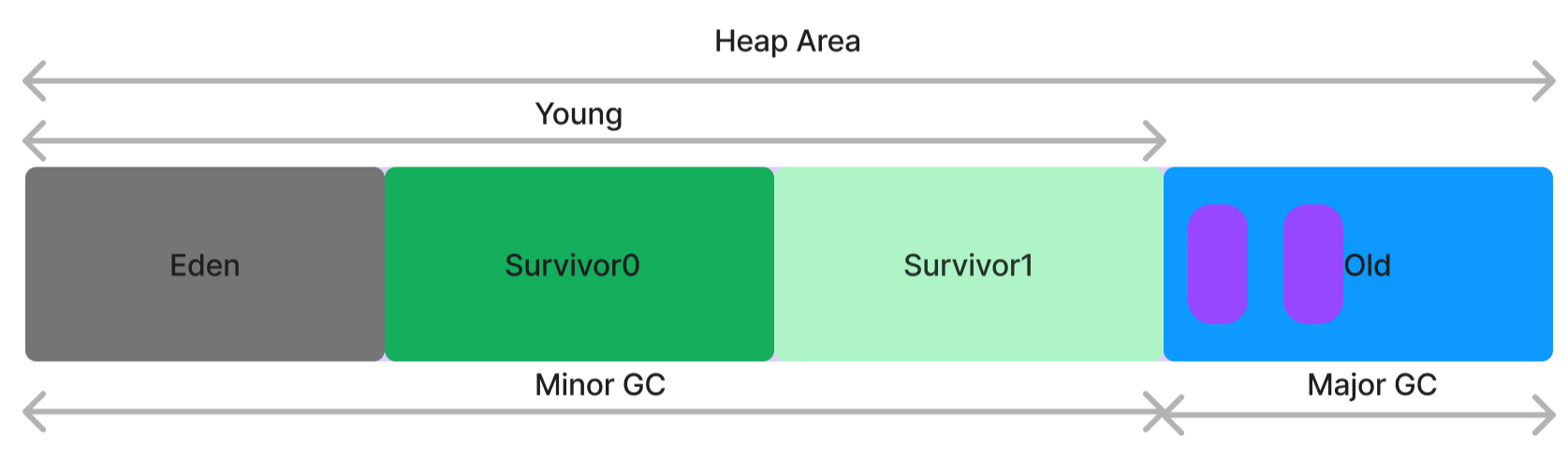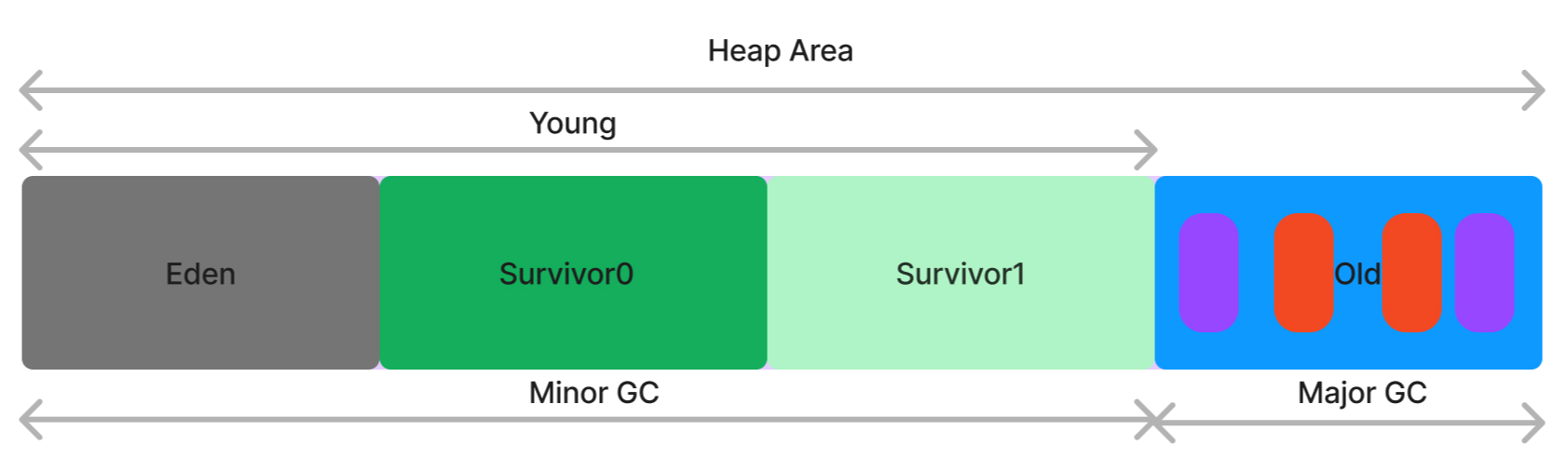 heap은 객체가 생성하고 Stack에 참조되다가 Stack에 참조가 되지 않으면 Mark 되지 않고 Sweep이 일어난다. 즉 GC가 일어난다. 여기서 GC를 할 때 Heap 영역 어디에서 일어나냐에 따라 GC이 달라진다.