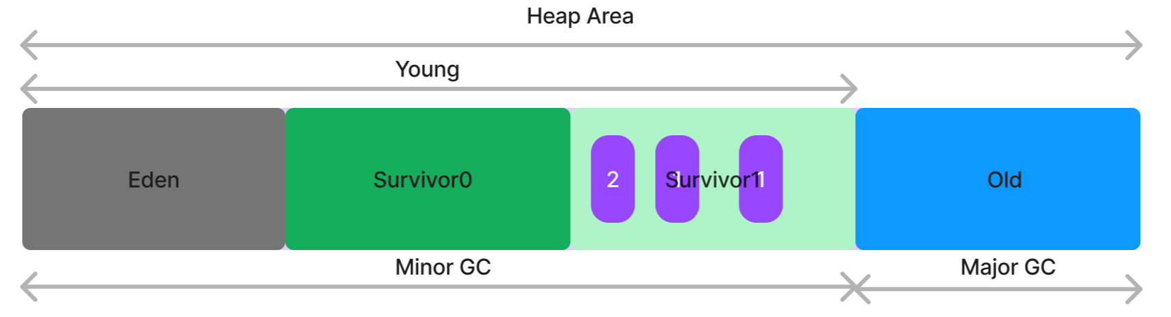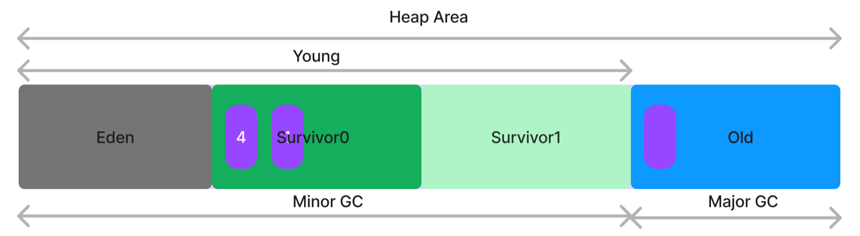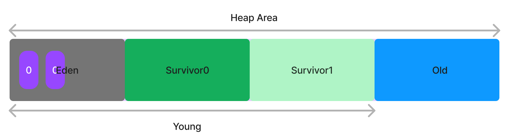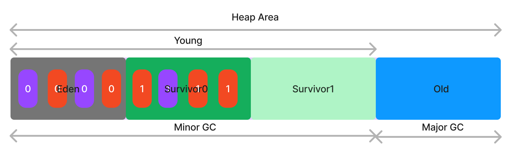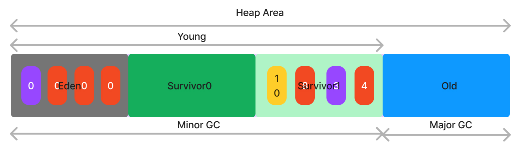 위 그림에서 Survivor0 영역이 차게 되어 Minor GC가 일어나면 살아남은 객체가 비워져 있는 Survivor1 영역에 배치된다.