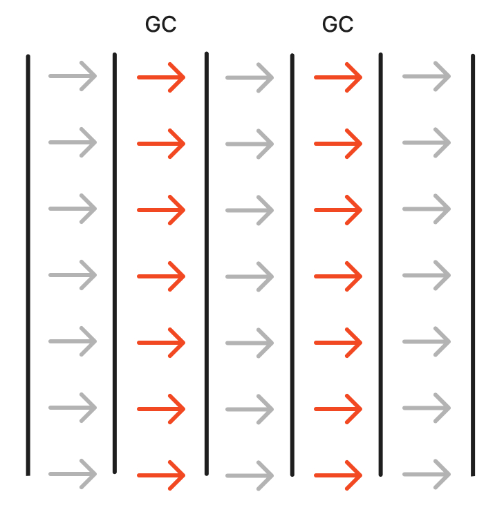 위 그림처럼 스레드를 여러 개를 사용하기에 빠르게 처리할 수 있다. 자세히 보면 윗그림보다 GC에서 화살표의 길이가 짧다.