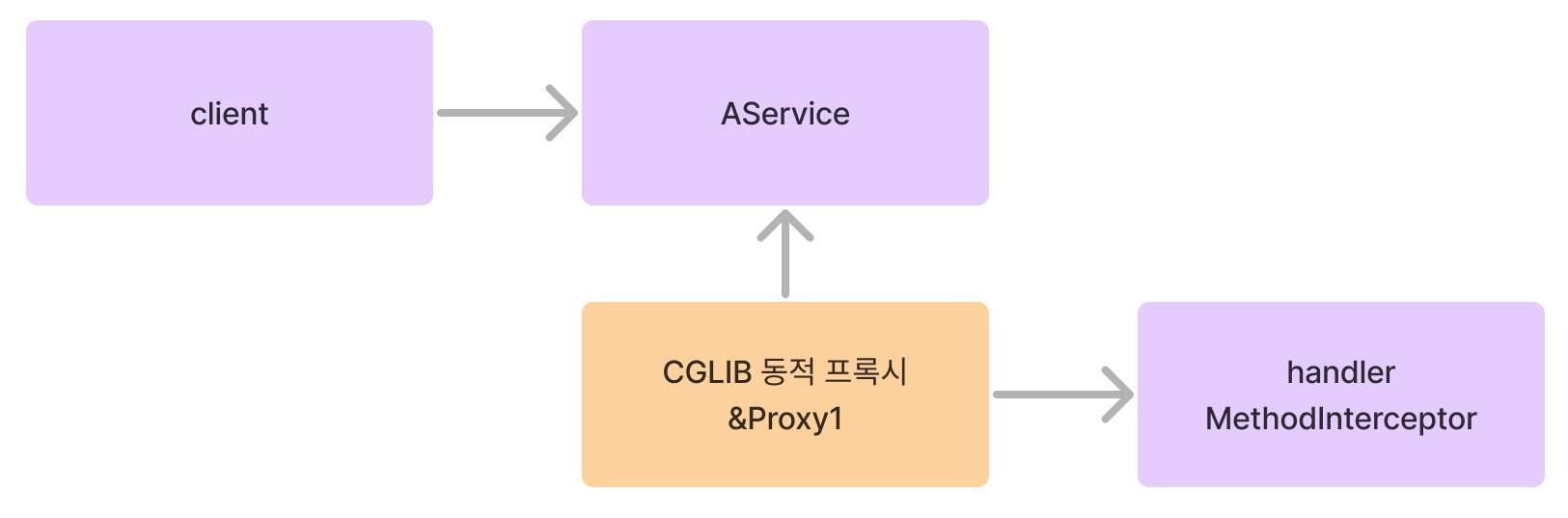 바이트코드를 조작해서 동적으로 클래스를 생성하는 라이브러리이다. 인터페이스가 없어서도 구체 클래스만 가지고 동적 프록시를 만들어낼 수 있다. 원래를 외부 라이브러리이나, 스프링프레임워크가 내부 소스 코드에 포함하였다. CGLIB는 MethodInterceptor를 제공한다. 실제로는 ProxyFactory가 사용하기 편하게 도와준다.