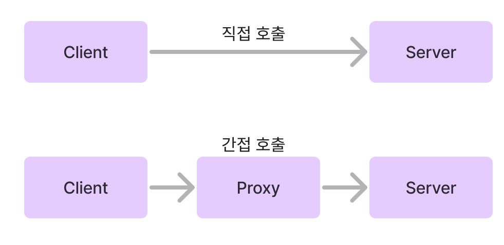 위 그림처럼 client가 server를 직접 호출할 수 있지만 client와 server사이에 대리자 즉 proxy를 두어 간접 호출할 수 있다. 아래처럼 간접 호출한 것을 대리자 proxy라고 한다.
