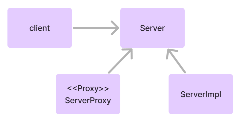 위 그림처럼 client가 server를 직접 호출할 수 있지만 client와 server사이에 대리자 즉 proxy를 두어 간접 호출할 수 있다. 아래처럼 간접 호출한 것을 대리자 proxy라고 한다.