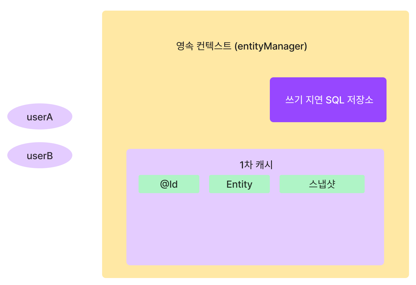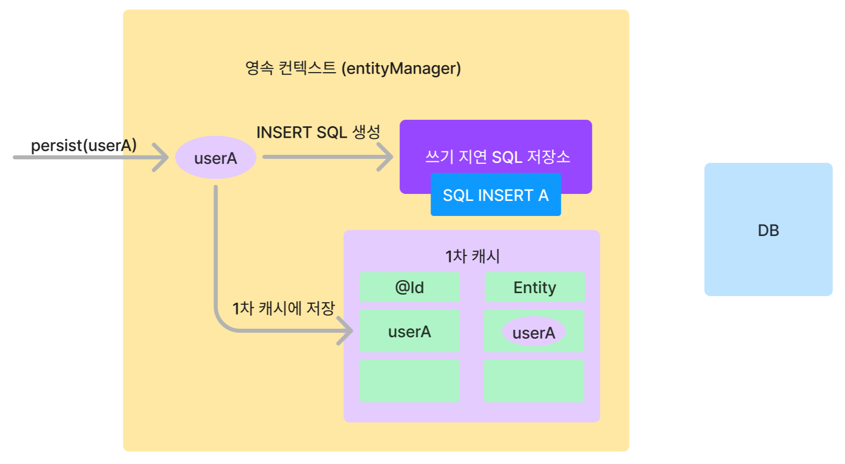 위 코드에서 em.persist(userA) 부분까지 그림으로 표현하면 위 그림과 같다. 위 그림처럼 psersist(userA)가 들어오면 쓰기 지연 SQL 저장소에 INSERT SQL을 저장하고 1차 캐시에 저장한다. 이때 INSERT SQL을 데이터 베이스에 보내지 않는다.