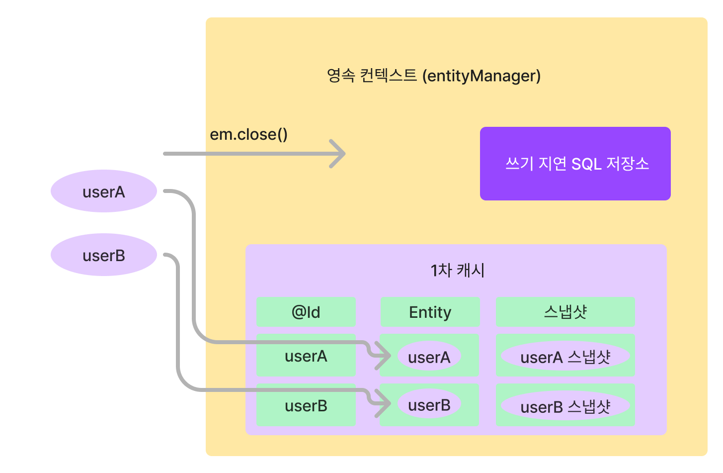 em.close(); // 영속성 컨텍스트 종료, userA가 준영속 상태가 된다.