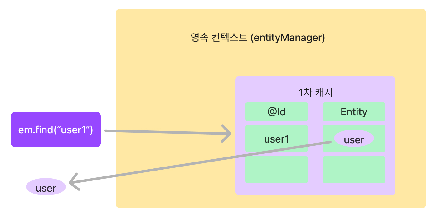 위 그림처럼 em.find를 통해서 먼저 영속성 컨텍스트의 1차 캐시에서 엔티티를 조회한다. 찾는 엔티티가 있는경우 1차 캐시에서 엔티티 조회하고 엔티티를 가져온다.