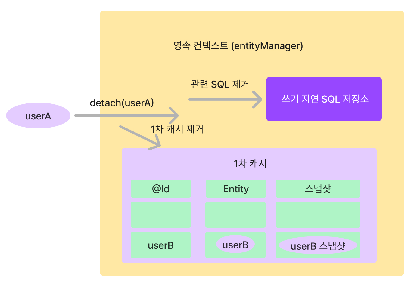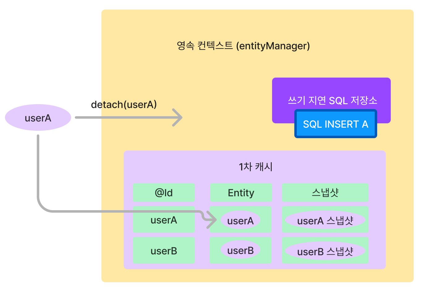 먼저 위 그림처럼 em.detach(userA)를 통해서 영속성 컨텍스트와 쓰기 지연 SQL 저장소에 존재하는 userA를 확인한다.
