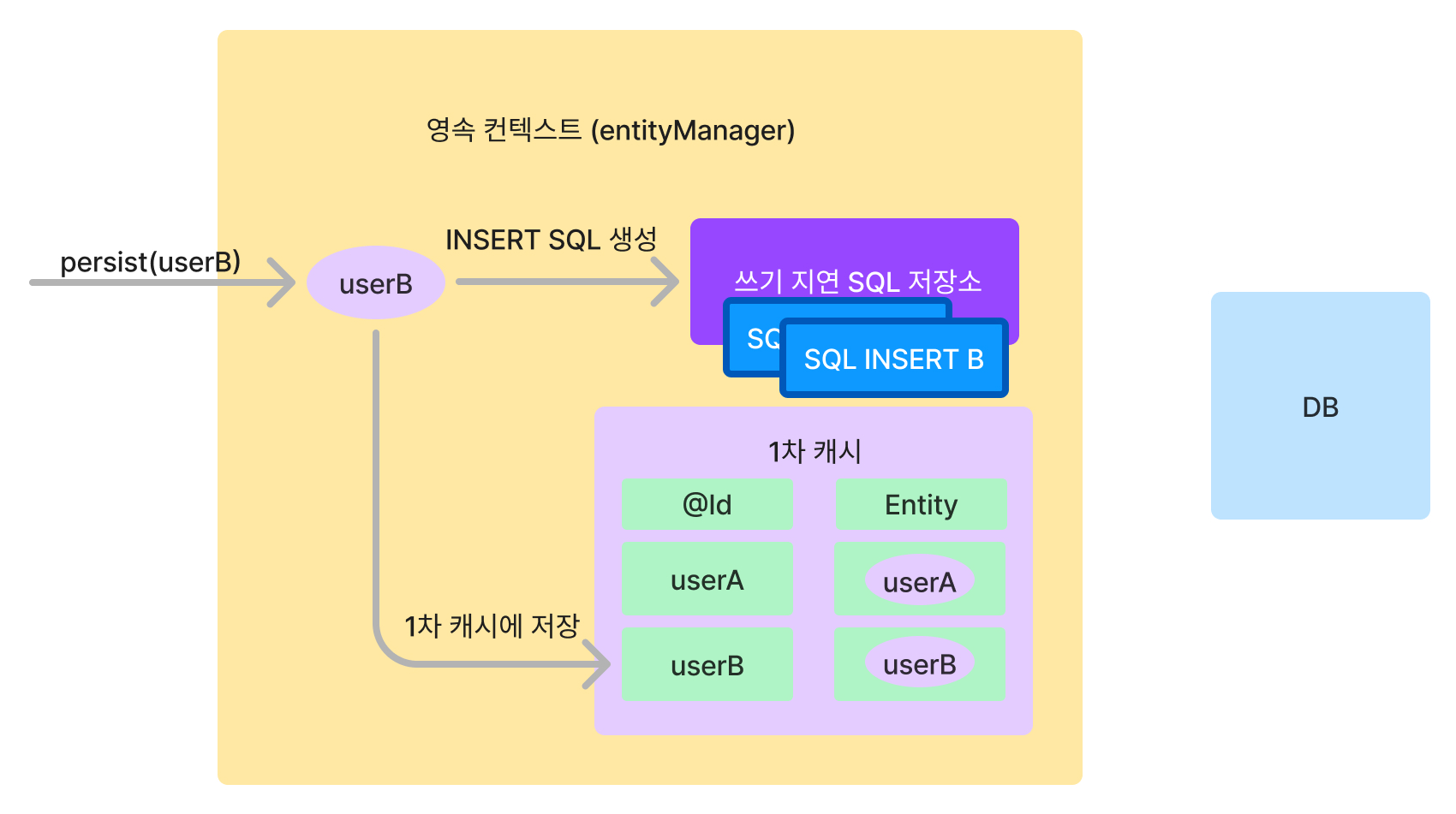 위 그림은 em.persist(userB) 부분까지 표현한 것이다. 위 그림처럼 persist(userB)가 들어오면 persist(userA) 때처럼 쓰기 지연 SQL 저장소에 INSERT SQL을 저장하고 1차 캐시에 저장한다. 이때도 INSERT SQL을 데이터 베이스에 보내지 않는다.