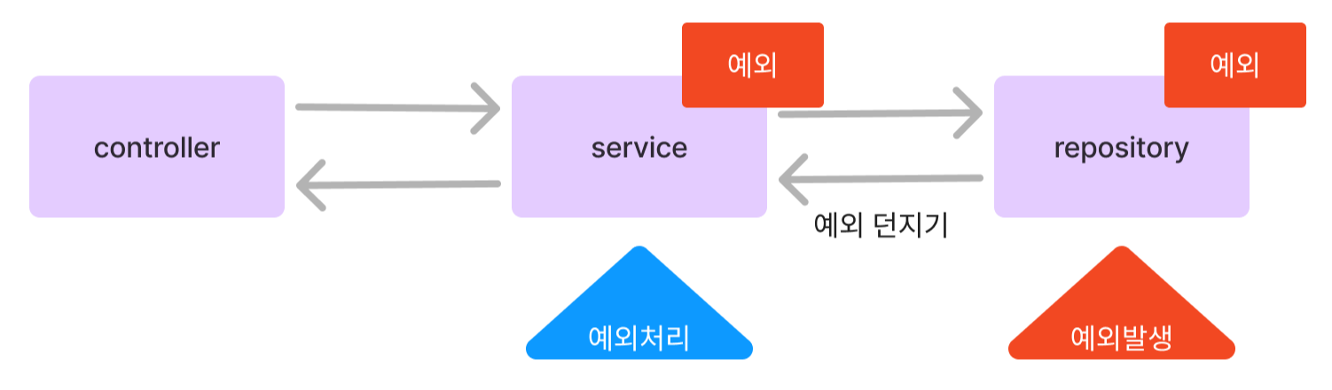 위 그림처럼 예외가 발생하고 중간(service구간)에서 예외를 처리하면 다음 로직에서는 정상적인 흐름을 반환한다. 예외를 catch로 잡으면 하위 예외들도 모두 잡을 수 있다.