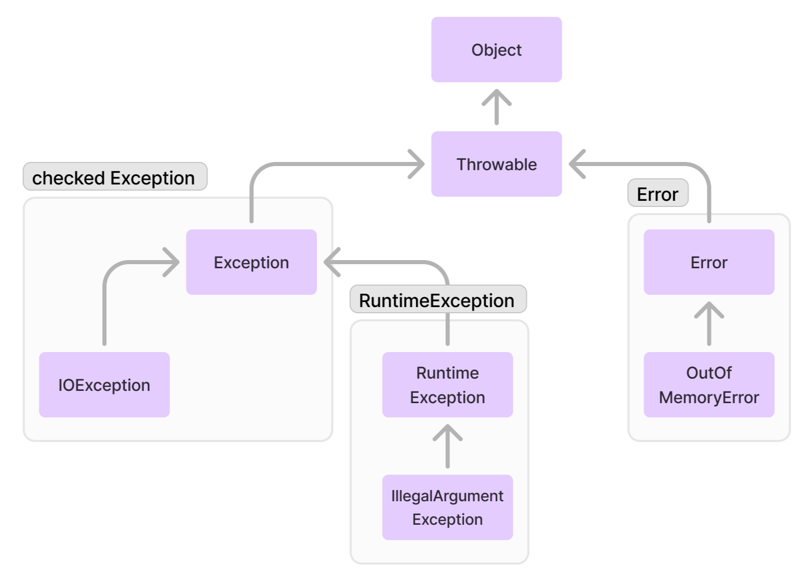 개발자가 구현한 로직에서 발새한 실수나 사용자의 영향에 의해 발생한다. 오류와 달리 미리 예측이 가능하여 상황에 맞게 예외처리를 해야 한다.