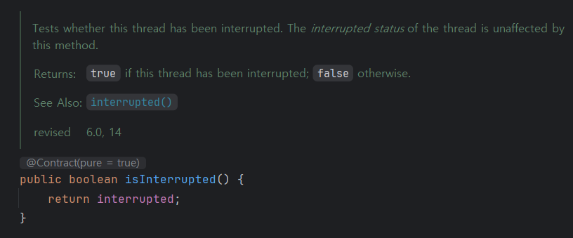 위 코드는 isInterrupted() 메서드 코드이다. 그저 interrupted를 출력한다. 이 점을 이해하고 과정을 다시 보면 스레드에 인터럽트가 발생되고 while문에서는 isInterrupted()가 true를 반환한다. 그래서 while문을 탈출한다. 하지만 여기서 그저 스레드의 interrupted의 값이 true, false 확인만 하고 넘어갔기에 다음 로직인 블로킹 메서드인 sleep()을 만나면 인터럽트 상태이기에 해당 스레드에 InterruptedException이 발생한다. 그래서 "인터럽트 미발생"이 아닌 "인터럽트 발생"이 출력된다.
