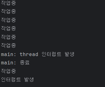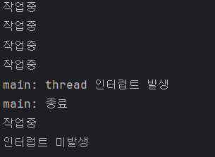 본문으로 돌아와서 interrupted() 메서드로 코드를 실행하면 결과는 예상 결과와 같은 "인터럽트 미발생"을 출력한다.