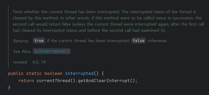 이를 해결하기 위해서는 위 코드처럼 isInterrupted() 메서드 대신에 interrupted() 메서드를 사용하면 된다.