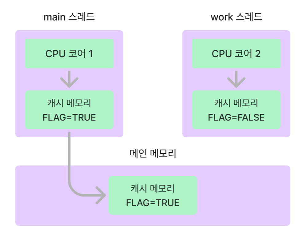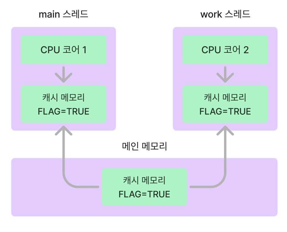 하지만 위 그림처럼 한 스레드에서 실제로 값을 변경했을 때 다른 스레드가 이를 알지 못하고 캐시메모리의 값으로 처리하면 공유자원인 FLAG를 FALSE값으로 인식하여 전혀 다른 값이 나올 수 있다.
