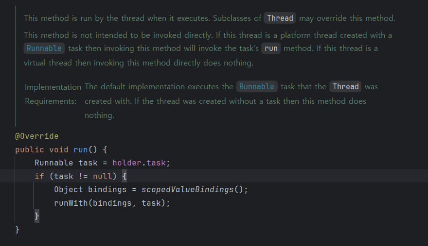 위 그림을 간단하게 설명하면 task의 값이 있으면 if문 로직을 실행한다. scopedValueBindings() 메서드를 통해서 이 스레드의 scope를 가져온다. runWith() 메서드를 호출한다.
