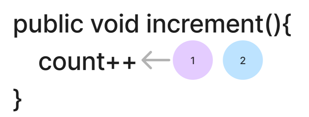 위 그림처럼 Thread 1과 2는 다른 스레드에서 접근하기에 동시에 실행되는 경우가 있다. 이런 경우 공유 자원인 count는 increment() 메서드를 따로 계산하여 2번이 아닌 1번만 호출하게 된다. 그래서 원하는 값인 2000이 아니라 1964라는 값이 나온다.