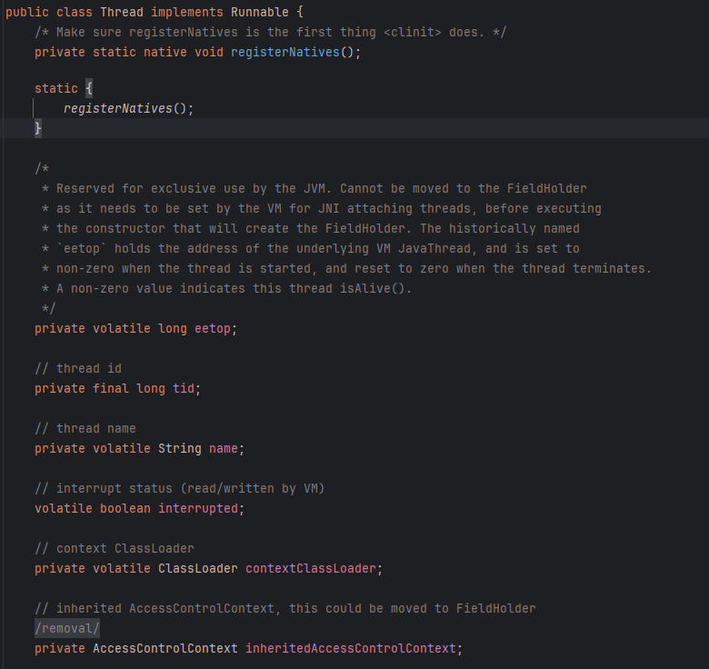 주석을 해석하면 JVM에서 독점적으로 사용하독록 예약되어 있다. FieldHolder를 생성할 생성자를 실행하기 전에 JNI 연결 스레드를 위해 VM에서 설정해야 하므로 FieldHolder로 이동할 수 없다. eetop은 기본 VM JavaThread의 주소를 보유하고 스레드가 시작할 때 0이 아닌 값으로 설정된다. 종료된 경우 0으로 재설정된다. 0이 아닌 값은 isAlive()를 나타낸다.