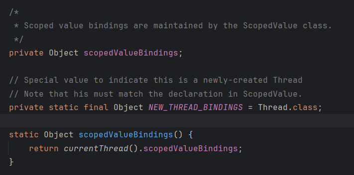 위 코드의 주석을 해석하면 "범위가 지정된 값 바인딩은 ScopedValue 클래스에 의해 유지된다."이다. 현재 스레드의 scope를 가져오는 메서드이다.