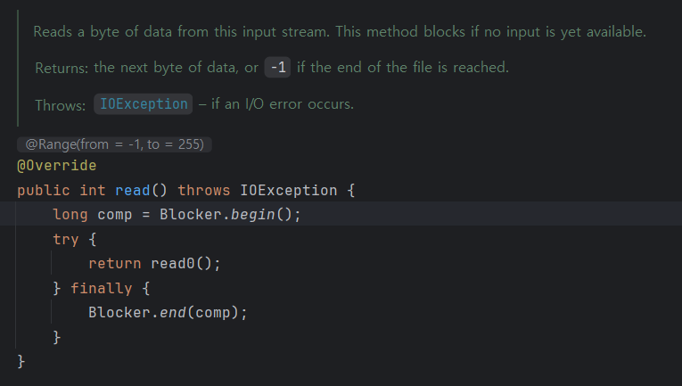 주석을 해석하면 "입력 스트림에서 데이터 바이트를 읽는다. 이 메서드는 아직 입력이 없으면 차단한다. 반환값: 다음 데이터 바이트를 반환, 파일 끝에 도달하면 -1을 반환한다."로 read 메서드는 파일에서 데이터를 byte 단위로 하나씩 읽어온다. 읽을 내용이 없으면 -1을 반환한다.