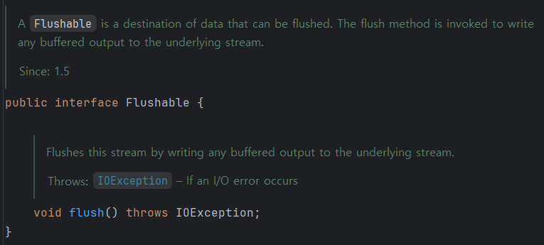 위 코드에 주석을 해석하면 "Flushable은 플러시 할 수 있는 데이터의 대상이다. 플러시 메서드는 버퍼링 된 출력을 기본 스트림에 쓰기 위해 호출된다."이다.
