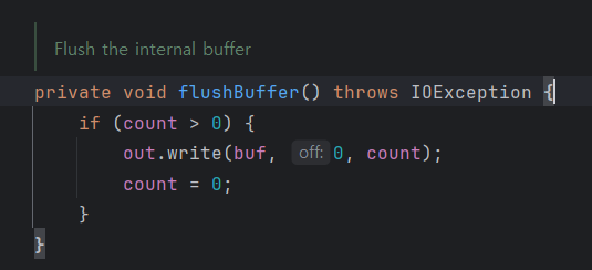 growIfNeeded를 호출하고 나서 if문에서 buf의 크기와 count값을 비교한다. 만약 count의 값이 큰 경우 flushBuffer 메서드를 호출한다. flushBuffer 메서드에서는 Buffer안에 값을 flush 한다.