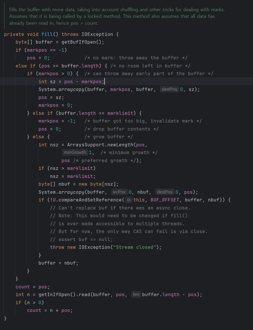 다음 if문을 보면 만약 markpos의 값이 -1이라면 pos의 값을 0으로 초기화한다. pos는 버퍼의 현재 위치를 의미한다. else if(pos >= buffer.length) 문을 보면 만약 pos의 값이 buffer의 크기보다 크다면 else if문을 실행한다. 다음 else if문안에 if(markpos >0)을 보면 markpos의 값이 0보다 크면 이전 데이터 중 mark 이후의 데이터만 유지하고 나머지는 버린다. 만약 else if(buffer.length >=marklimit) 문처럼버퍼가 marklimit보다 크거나 같으면 mark를 무효화하고 버퍼를 초기화한다. 그 외는 새 버퍼 크기(nsz)는 현재 크기(pos), 최소 성장값, 선호 성장값을 기반으로 계산한다. 새 배열(nbuf)로 데이터를 복사하고 Unsafe.compareAndSetReference로 기존 배열을 교체합니다. 실패 시 스트림이 닫혔음을 나타내는 예외를 던집니다.