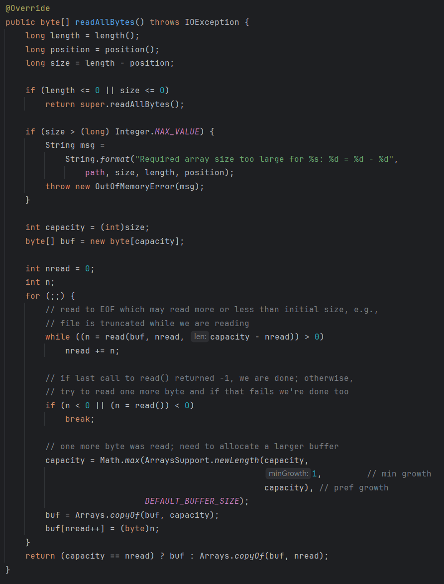 그리고 다음 if문을 보면 size의 크기가 Integer.MAX_VALUE값을 넘는 경우 OOM(OutOfMemoryError)가 발생한다. OOM은 자료형의 범위를 넘는 숫자가 들어오면 원래 숫자가 아닌 다른 숫자가 출력되는 것을 의미한다. 즉 Integer.MAX_VALUE보다 큰 숫자가 들어오면 readAllBytes 메서드에서는 OOM 에러가 발생할 수 있다는 것을 인지해야 한다.
