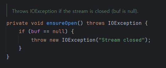 위 코드를 보면 getBufIfOpen메서드를 통해서 buffer을 출력한다. 이는 현재 스트림이 열려 있는지 확인하고, 내부 버퍼 배열을 가져온다. 스트림이 닫혀 있으면 예외를 던진다.