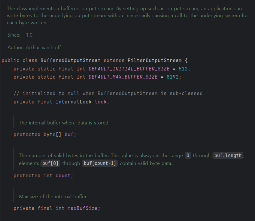 위 코드는 BufferedStream에서 봤던 것처럼 BufferedOutputStream은 buf 즉, Buffer로 코드를 처리한다. 또한 위 코드의 주석을 해석하면 "이 클래스는 버퍼링 된 출력 스트림을 구현한다. 이 클래스는 데이터를 한 바이트씩 출력하지 않고, 버퍼에 저장한 후 일정량을 모아서 한 번에 출력한다."이다. 다음 변수들인 buf 필드는 내부 Buffer이고 count의 주석을 해석하면 "이 변수는 Buffer 안에 현재 저장된 유효한 바이트의 개수를 나타낸다. count는 항상 0 ~ buf.length 사이의 값을 가진다. 버퍼 내에서 유효한 데이터는 buf [0]~buf [count-1]까지이다."이다.