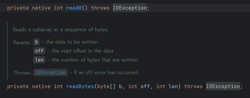 위 메서드 코드에서 native는 다른 언어들(C, C++)로 작성된 라이브러리를 호출한다고 생각하면 된다. 그러므로 코드이름처럼 한 글자씩 read 하거나 byte크기를 정해서 파일을 읽는다고 파악하면 된다.