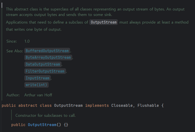 생성자 코드의 주석을 보면 InputStream과 같이 OutputStream도 추상 클래스이기에 같은 주석이 달렸다. 위에 쓴 글과 같이 하위 클래스에서 super()를 통해 이 생성자를 호출하여 OutputStream의 초기화 과정을 상속받을 수 있다.