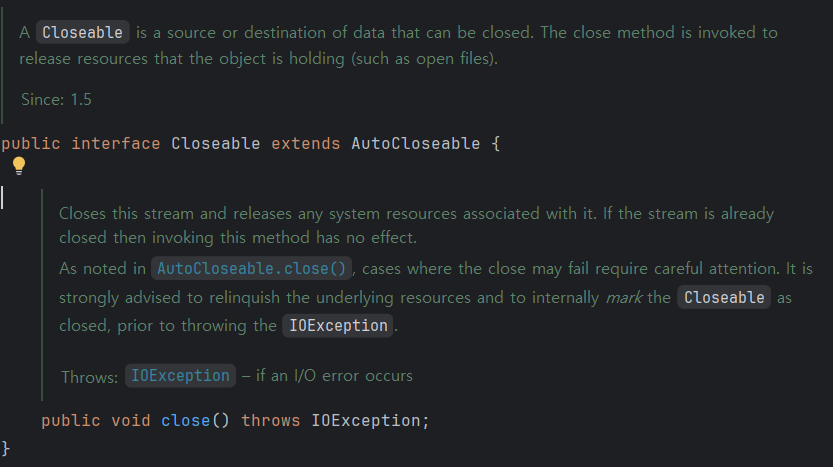 위 주석을 해석해보면 "Closeable은 닫을 수 있는 데이터의 소스 또는 대상이다. close 메서드는 객체가 보유하고 있는 리소스(예: 열린 파일)를 해제하기 위해 호출된다."이다.