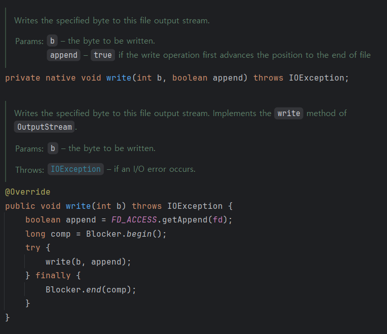 먼저 write(int b, boolean append) 메서드는 native 메서드이기에 자바가 아닌 네이티브 코드인 C, C++로 구현되어 있다. 메서드의 주석을 해석하면 "지정된 바이트를 이 파일 추력 스트림에 쓴다."이다. 즉 이 메서드는 바이트 값을 파일에 기록하는 동작을 수행한다는 의미이다.