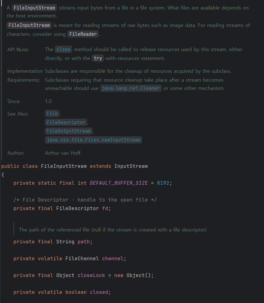 위 코드에 주석을 해석하면 "FileInputStream은 파일 시스템의 파일에서 입력 바이트를 얻는다. 사용 가능한 파일은 호스트 환경에 따라 다르다. FileInputStream은 이미지 데이터와 같은 원시 바이트 스트림을 읽는 데 사용된다. 문자 스트림을 읽으려면 FileReader를 사용하는 것이 좋다."이다. FileReader는 나중에 설명하겠다.