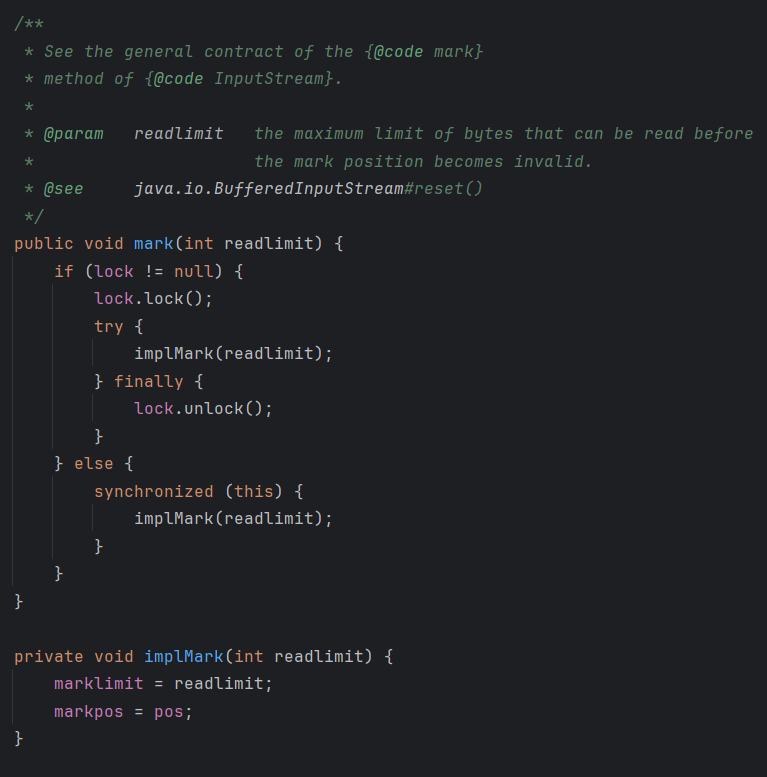 위 mark(int readlimit) 코드를 보면 다른 BufferedIuputStream의 write 메서드 코드와 유사하다. mark(int readlimit) 메서드도 유사하게 실행된다고 생각하면 될 것 같다.