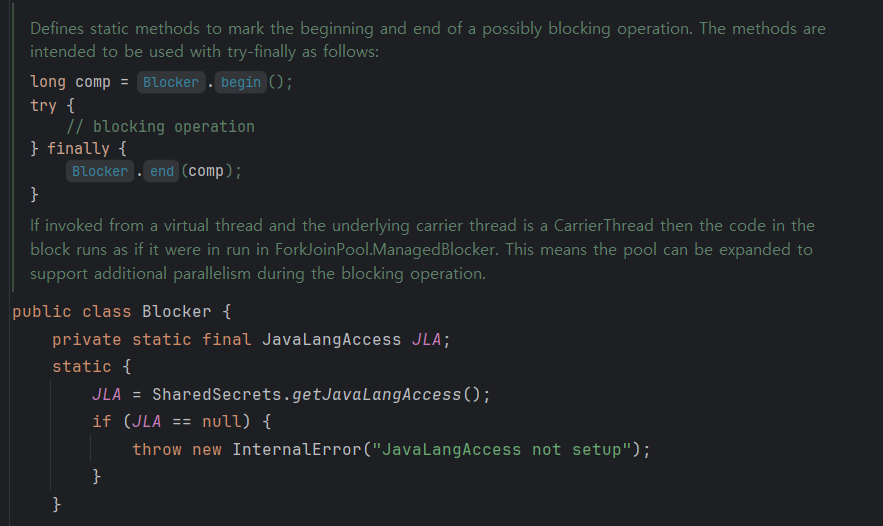 위 코드에 주석을 해석하면 " 잠재적으로 블로킹 작업이 시작되고 끝나는 지점을 표시하기 위한 정적 메서드를 정의한다. 이 메서드는 다음과 같이 try-finally 블록에서 사용하도록 설계됐다. 가상 스레드에서 이 메서드를 호출하고, 해당 스레드가 CarrierThread(기저 스레드)에서 실행된다면, 이 블록의 코드는 ForkJoinPool.ManagedBlocker에서 실행되는 것처럼 동작한다. 이는 블로킹 작업 동안 추가 병렬 처리를 지원하기 위해 스레드 풀이 확장될 수 있음을 의미한다."이다.