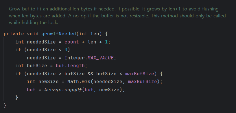 다음으로 len의 크기가 maxBufSize보다 작은 경우 growIfNeeded(int len) 메서드를 호출한다. growIfNeeded(int len) 메서드를 통해서 Buffer 크기를 설정한다.