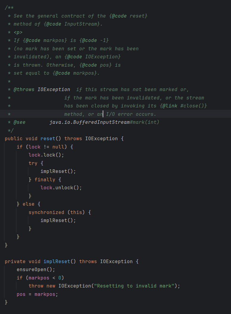 위 reset() 메서드의 주석을 해석하면 "markpos가 -1인 경우 마크가 설정되지 않거나, 무효화되었음을 의미한다. 이경우 IOException 예외를 발생한다. markpos가 -1이 아닌 경우 pos를 markpos와 같은 값으로 변환합니다. 읽기 위치를 마지막으로 설정된 마크 위치로 변환한다."이다.