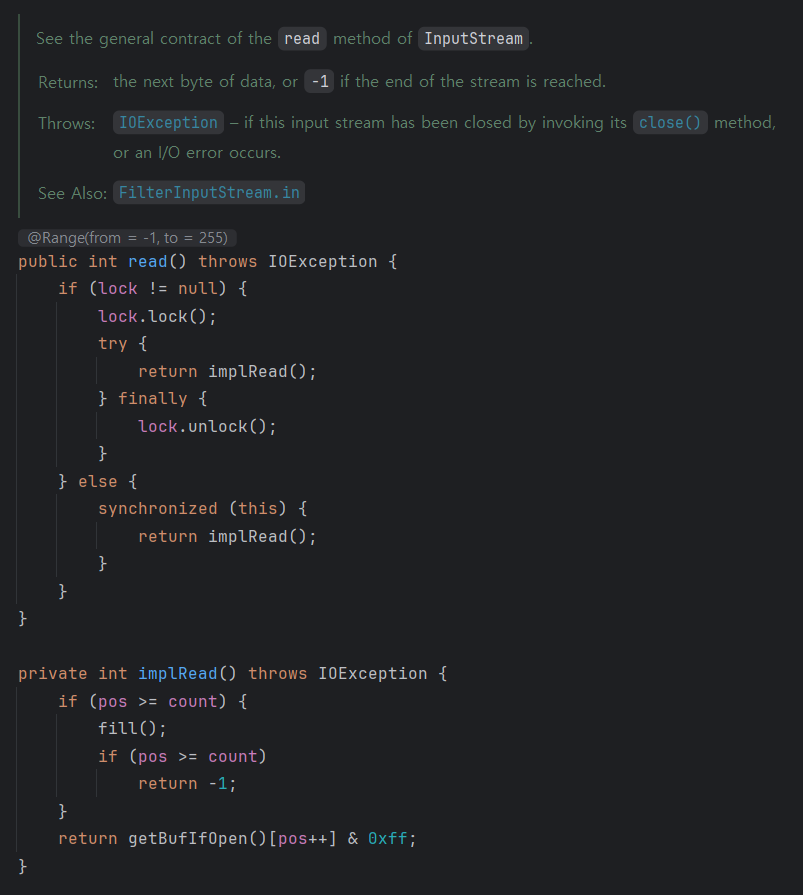 주석을 해석하면 "입력 스트림에서 데이터 바이트를 읽는다. 이 메서드는 아직 입력이 없으면 차단한다. 반환값: 다음 데이터 바이트를 반환, 파일 끝에 도달하면 -1을 반환한다."로 read 메서드는 파일에서 데이터를 byte 단위로 하나씩 읽어온다. 읽을 내용이 없으면 -1을 반환한다.