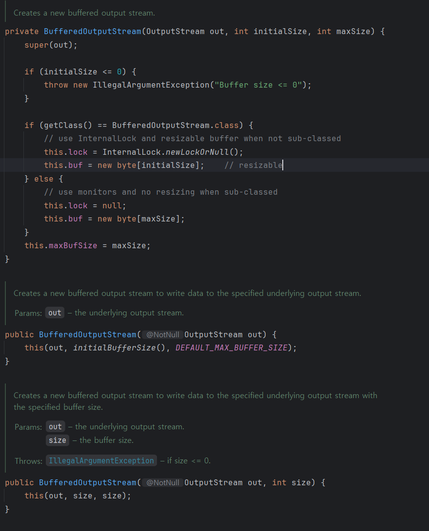 그 아래 생성자를 보면 그냥 OutputStream만 있어도 되는 경우랑 크기를 설정해서 넣는 경우가 있다. 나머지는 this로 위 생성자를 호출한다.