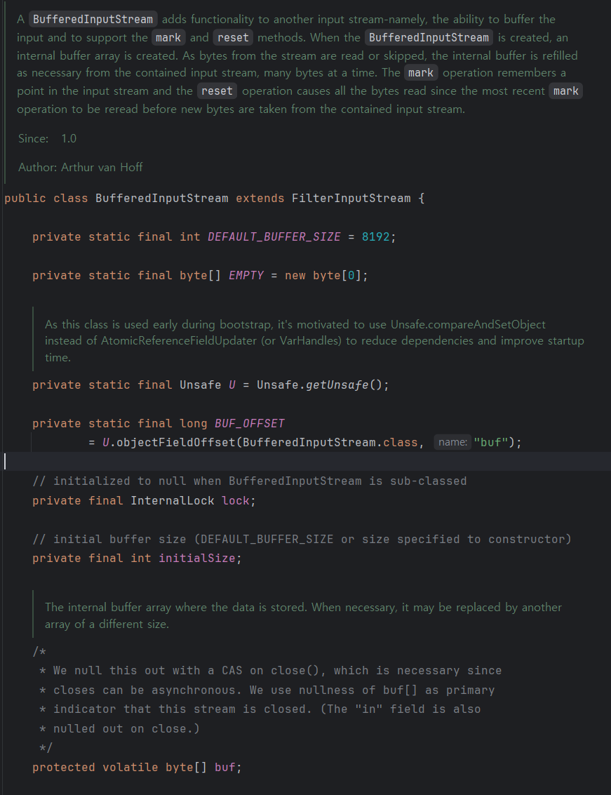BUF_OFFSET는 buf 필드의 메모리 오프셋이다. Unsafe를 사용하여 BufferedInputStream 객체의 buf 필드에 안전하게 접근하기 위해 계산된다. lock 내부 동기화를 위한 내부 lock이다. BufferedInputStream이 하위 클래스로 확장되면 null로 초기화된다. initialSize는 초기 버퍼 크기이다. buf는 내부 버퍼 배열로 데이터를 저장한다. buf가 null이면 스트림이 닫혔음을 나타낸다.