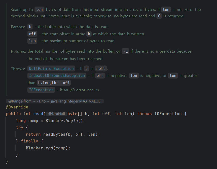 위 코드에 주석을 해석하면 "입력 스트림에서 최대 len 바이트의 데이터를 바이트 배열로 읽는다. len이 0이 아니면 이 메서드는 입력이 가능할 때까지 블로킹(대기) 상태로 유지한다. 0이라면 데이터를 읽지 않고 0을 반환한다.