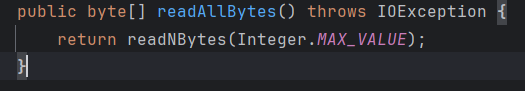readNBytes 메서드는 파라미터의 크기만큼의 버퍼를 만들고 파일을 읽는다. 위 코드에서 Integer의 최댓값으로 버퍼를 만들고 파일을 읽는다.
