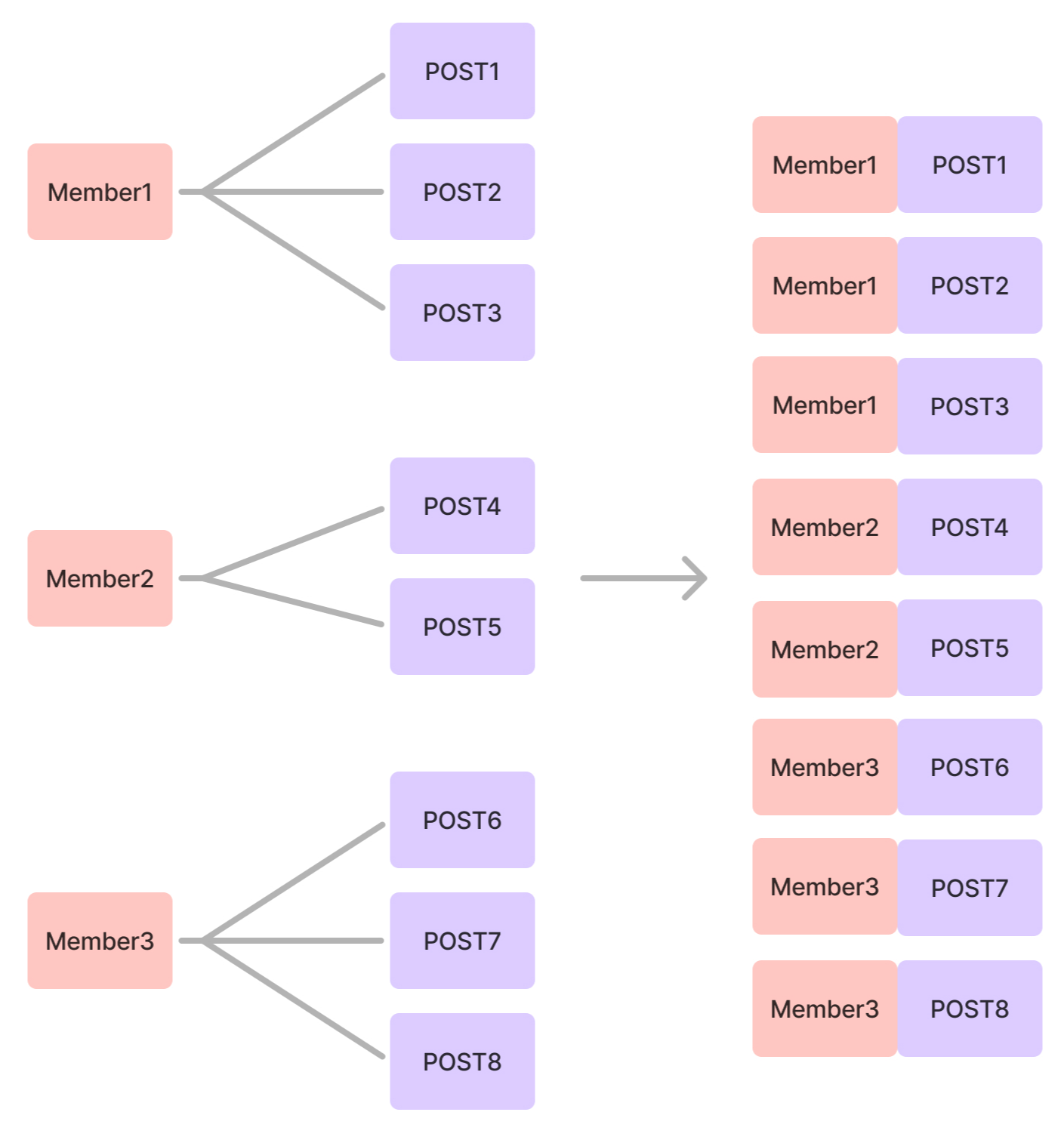 먼저 위 그림을 이해하면 Member와 Post가 1:N관계를 가지고 있다. 그리고 왼쪽 그림을 보면 Fetch Join을 실행한 결과이다. 실제로 Fetch Join을 하면 Inner Join으로 실행되기에 다음과 같은 결과 값이 나온다.